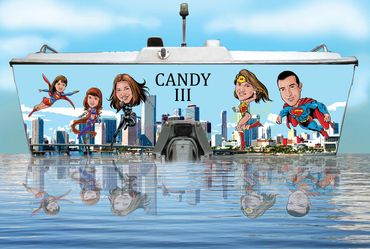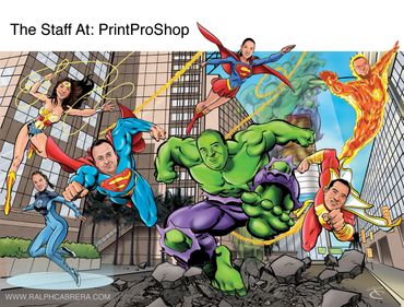 You can achieve powerful results by personalizing your presentation, in store display, invitation, greeting card. You can add drama to your Conference Room or Home Theater by showcasing an original caricature of your choice by Ralph Cabrera. Take a close look at the superhero, customized wedding caricature, wall , boat or car wrap and order your specialty today.